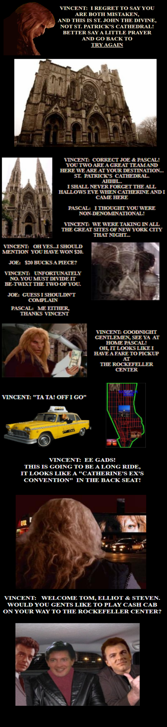 | VINCENT: CORRECT JOE AND PASCAL! YOU TWO ARE A GREAT TEAM! HERE WE ARE AT YOUR DESTINATION... ST. PATRICK'S CATHEDRAL. AHHH...I SHALL NEVER FORGET THE ALL HALLOW'S EVE WHEN CATHERINE AND I CAME HERE. PASCAL: I ALWAYS THOUGHT YOU WERE NON-DENOMINATIONAL. VINCENT: WE WERE TAKING IN ALL THE GREAT SITES OF NEW YORK CITY THAT NIGHT MY FRIEND. |