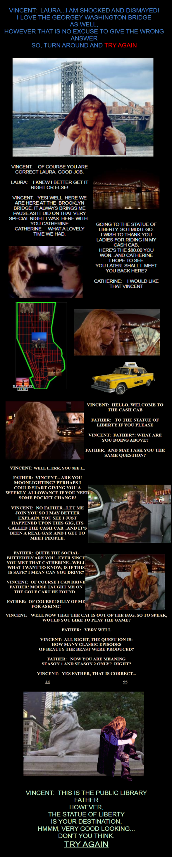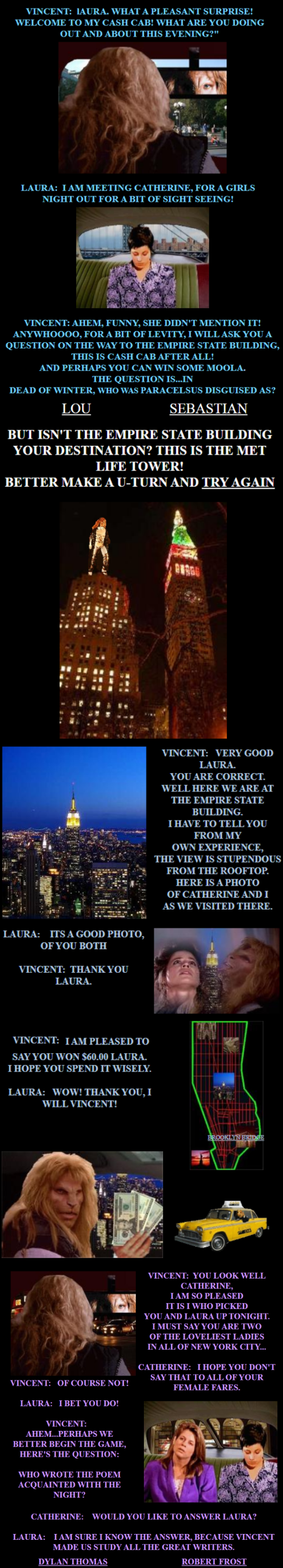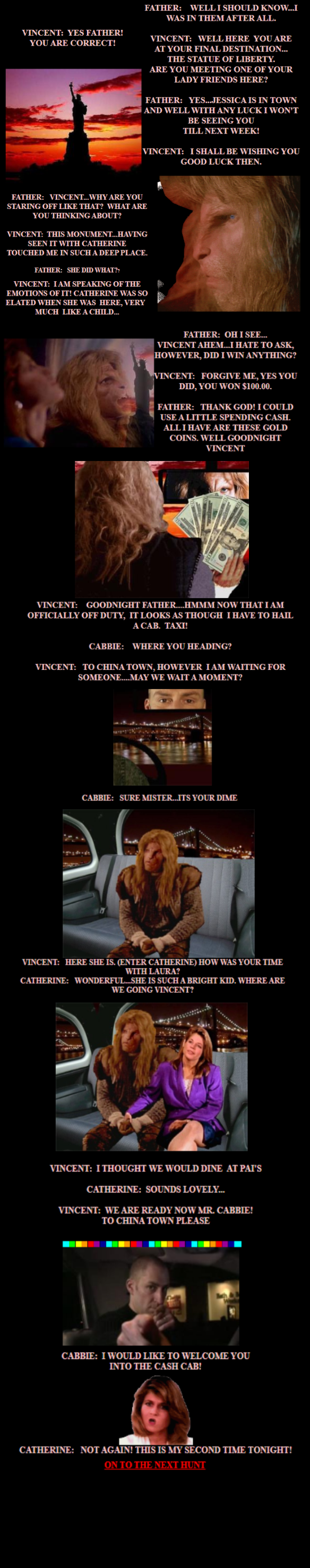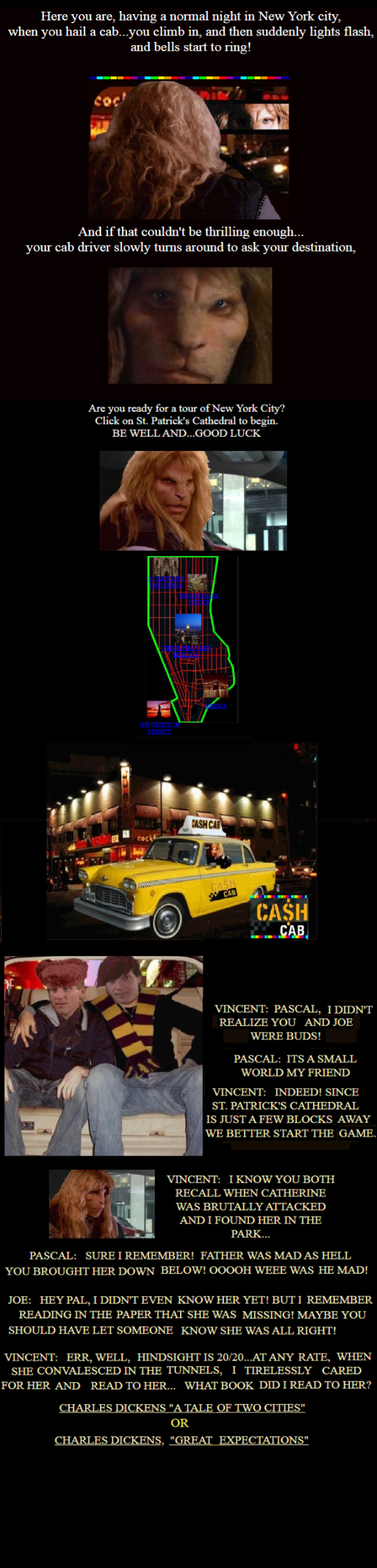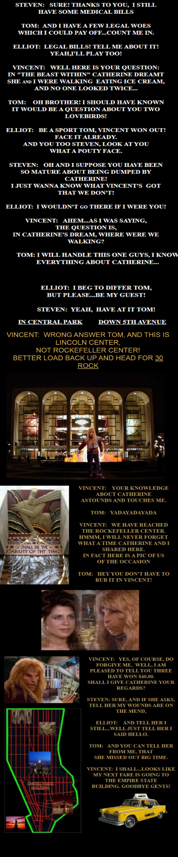 TOM: VINCENT? CATHERINE'S VINCENT? OH MY, GREAT! WELL THIS SURE TOPS OFF MY NIGHT! STEVEN: WELL, WELL, WELL, I HAVEN'T SEEN YOU SINCE I KIDNAPPED CATHERINE. HOW THE HELL ARE YA? VINCENT: TOP NOTCH THANK YOU. WELL SINCE YOU HAVE ENTERED THE CASH CAB, WOULD YOU CARE TO PLAY, AND WIN SOME MONEY? STEVEN: SURE! I STILL HAVE SOME MEDICAL BILLS TO PAY OFF THANKS TO YOU VINCENT! TOM: AND I HAVE A FEW LEGAL BILLS FROM SOME PAST LAW SUITS, SO COUNT ME IN ELLIOT: LAW SUITS! TELL ME ABOUT IT! YEAH, I'LL PLAY TOO. VINCENT: WELL HERE IS YOUR QUESTION: IN "THE BEAST WITHIN" CATHERINE DREAMT SHE AND I WERE WALKING, EATING ICE CREAM AND NO ONE LOOKED TWICE... AND... TOM: OH BROTHER! WE SHOULD HAVE GUESSED IT WOULD BE A QUESTION ABOUT YOU TWO LOVEBIRDS! ELLIOT: BE A SPORT TOM! FACE IT VINCENT WON OUT! BOTH YOU AND STEVEN ARE A COUPLE OF SORE LOSERS! WHAT DID OUR THERAPIST JUST TELL US? STEVEN: I KNOW, HE SAID WE HAVE TO MOVE ON. BUT I JUST WANNA KNOW WHAT DOES VINCENT HAVE THAT WE DON'T! ELLIOT: I DON'T THINK I WOULD GO THERE IF I WERE YOU! VINCENT: AHEM...AS I WAS SAYING, THE QUESTION IS, WHERE WERE CATHERINE AND I WALKING IN HER DREAM? CENTRAL PARK OR FIFTH AVENUE TOM: CENTRAL PARK OF COURSE! VINCENT: WRONG ANSWER, CARE TO GUESS AGAIN? TOM: SURE, WELL MY OTHER GUESS WOULD BE YOU WERE WALKING ON 5TH AVENUE. YEAH IT HAD TO BE ON 5TH AVENUE! WAIT! THIS IS OUR STOP! VINCENT: WRONG LANDMARK. THIS IS LINCOLN CENTER, NOT ROCKEFELLER CENTER. TOM: JEEZ MY BAD, YOU ARE RIGHT, THIS IS THE LINCOLN CENTER! |